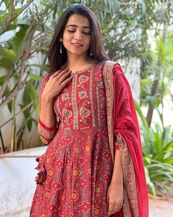 Women’s Cotton Anarkali Embroidery Designer Long Anarkali Kurti With Pant and Dupatta